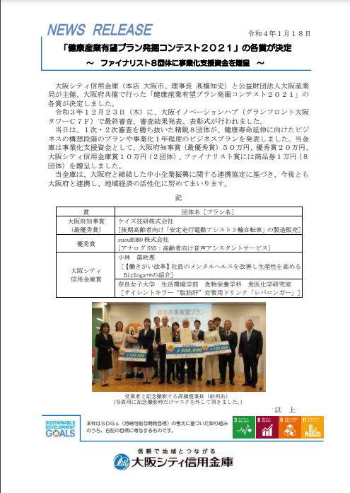 【プレスリリース掲載】大阪シティ信用金庫様より 健康産業有望プラン発掘コンテスト 2022.01.19